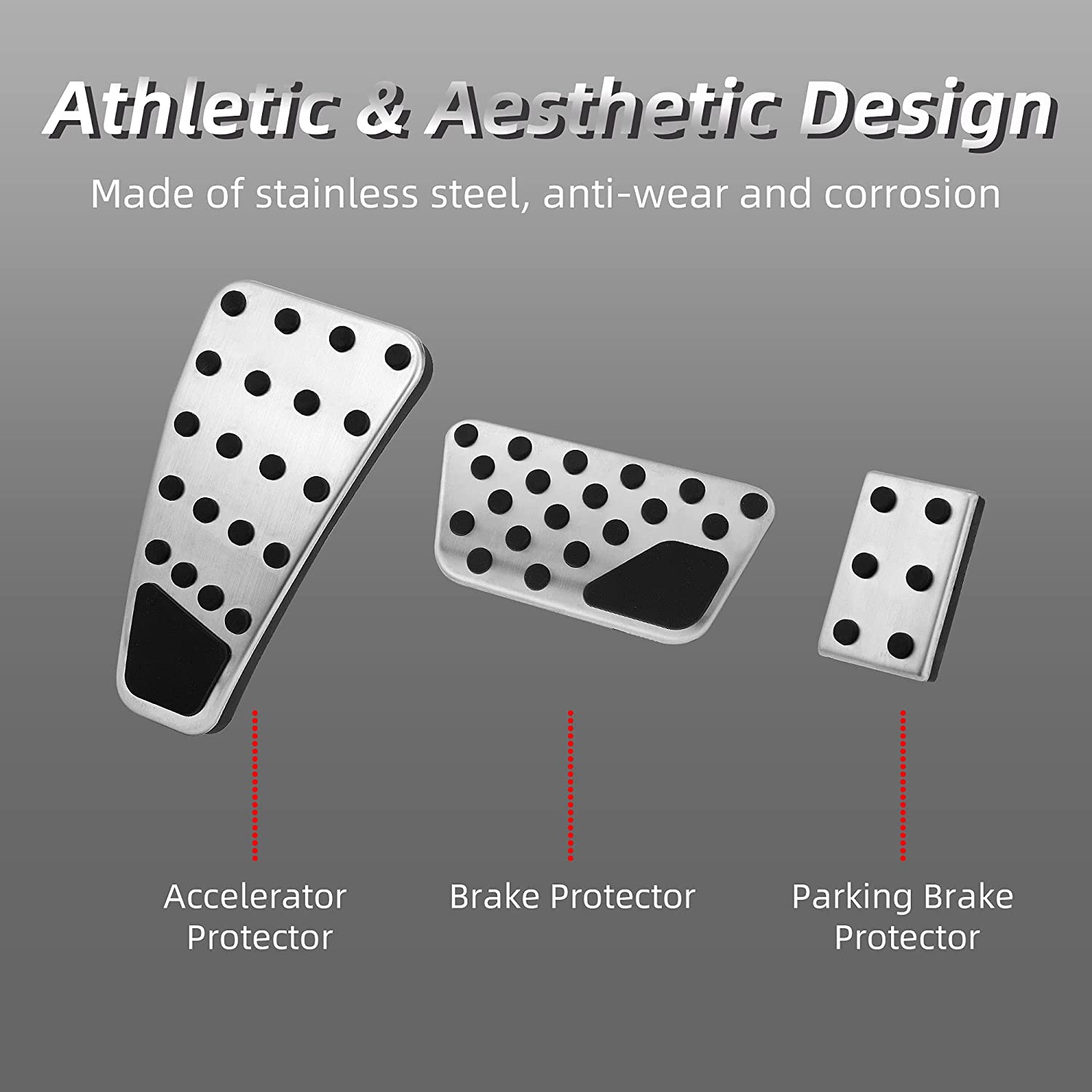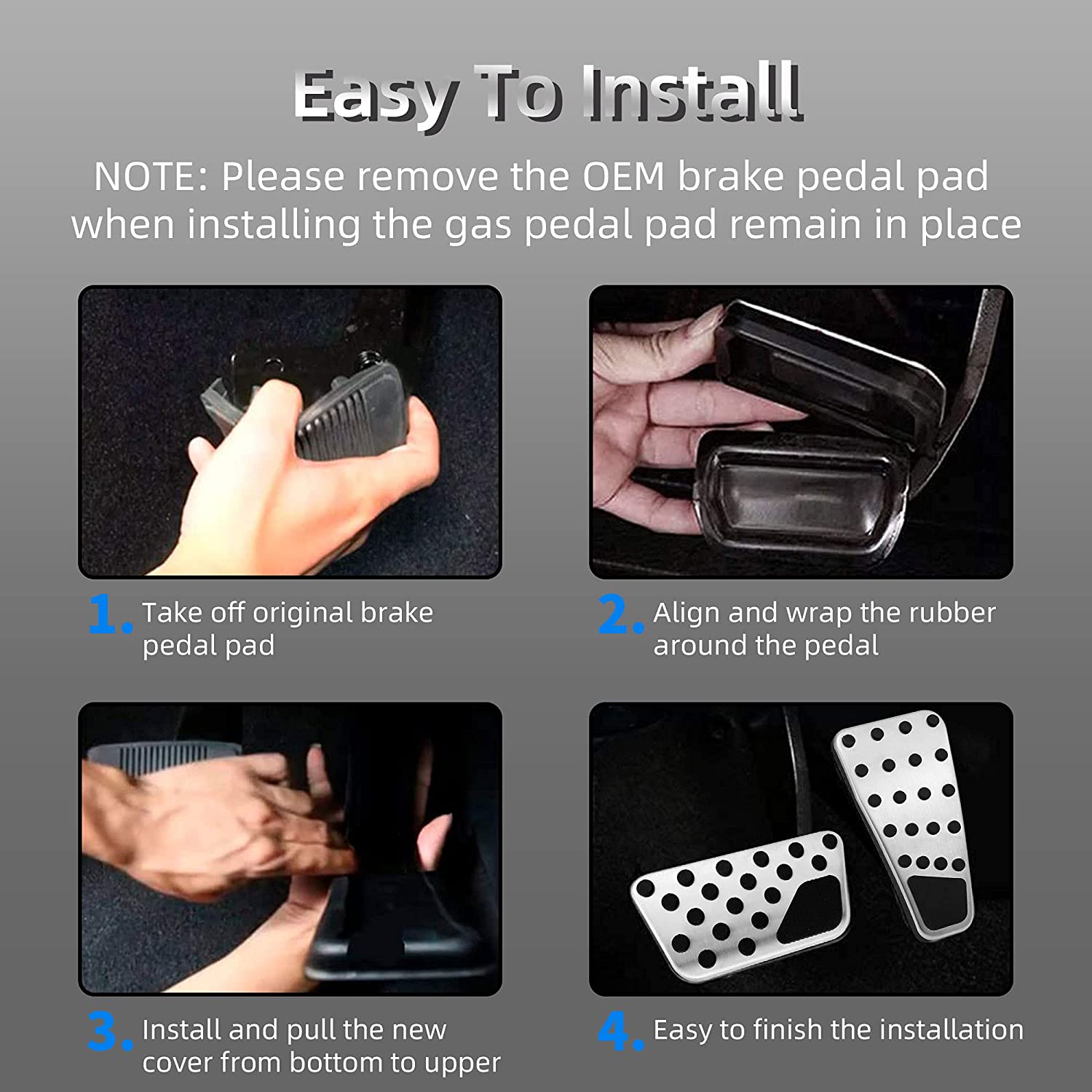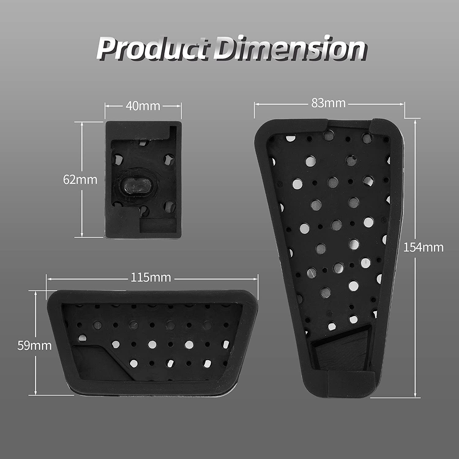 - Installation: The existing rubber of the brake pedal(only brake pedal) need to be removed before installing this. Then install the pedal at the appropriate position of the corresponding pedal, and make sure that the installed parts are not loose. No drilling or welding required. Recommend to immerse the pedal cover in hot water or use soap on the rubber portion about 10-15 minutes for easier installation.