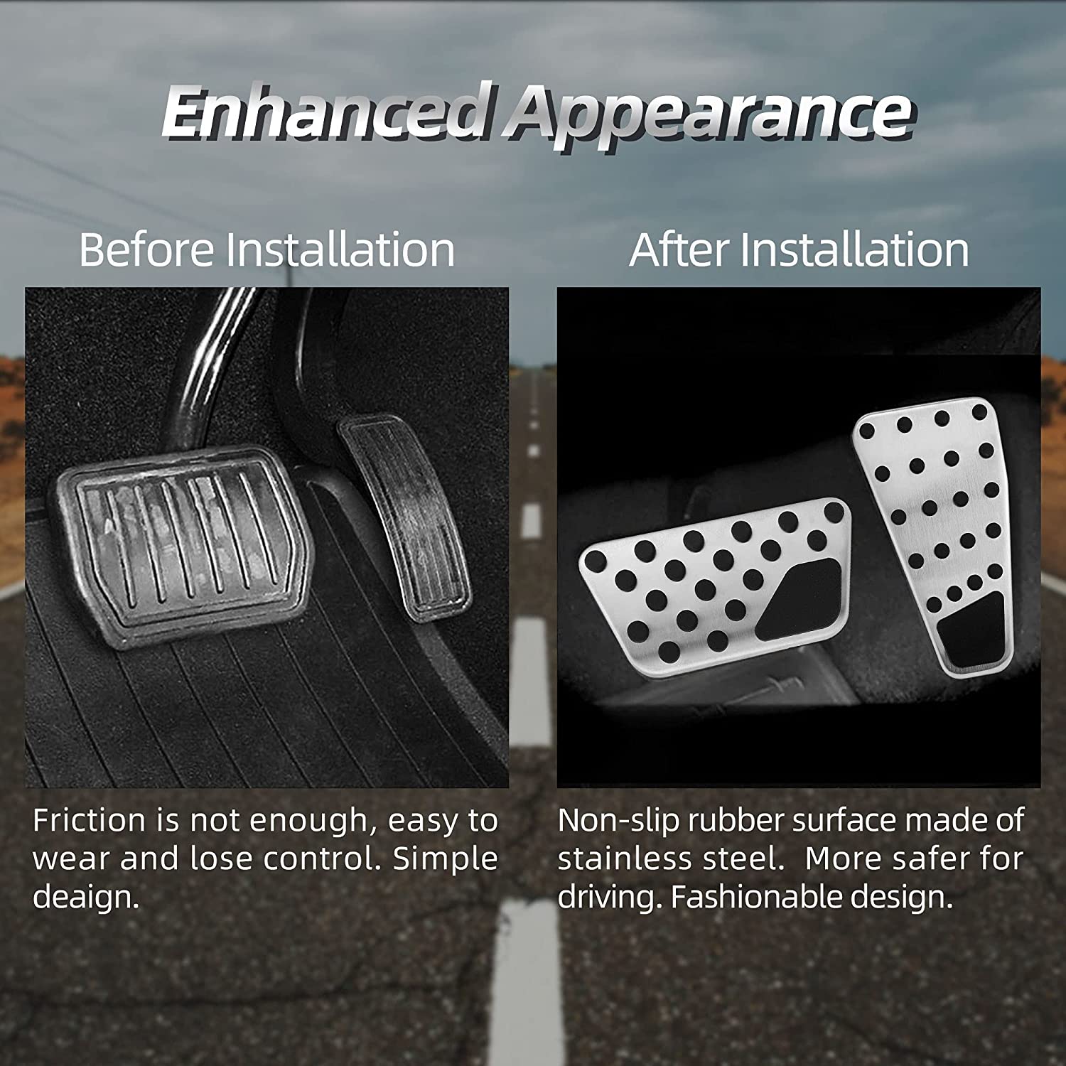 - Safer: Thickened Anti-slip particles have a cushioning effect on the force of the feet. After installation, the force-receiving area of the sole and the pedal can be increased, which increases the controllability of the pedal and driving safety, and makes the foot feel more comfortable.